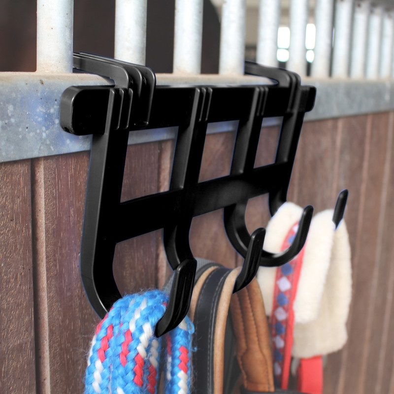 Praktische Hakenleiste für allerlei Stallzubehör. Hier können zum Beispiel Halfter, Stricke und Trensen griffbereit verstaut werden.