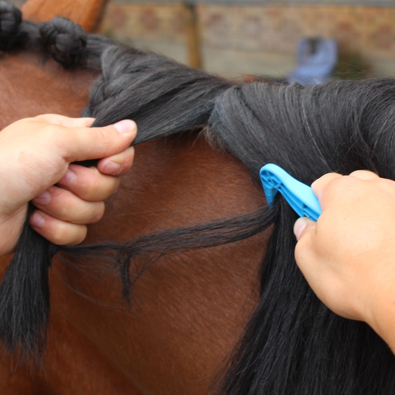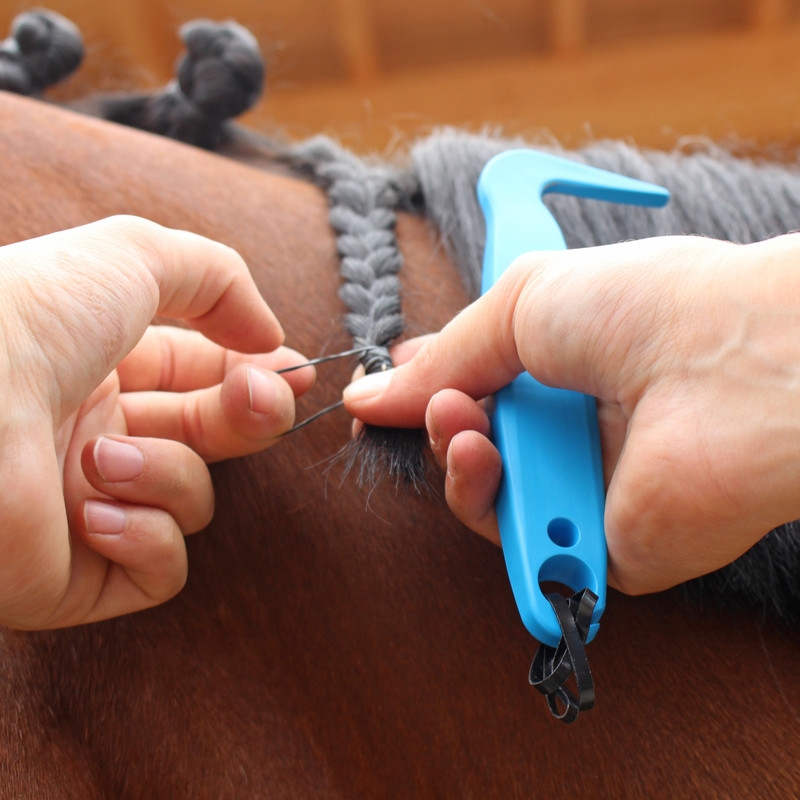 Mit dem Haken kann die Mähne des Pferdes sauber für jeden Zopf abgeteilt werden und die unten am Griff eingehängten Mähnengummis sind schnell griffbereit.