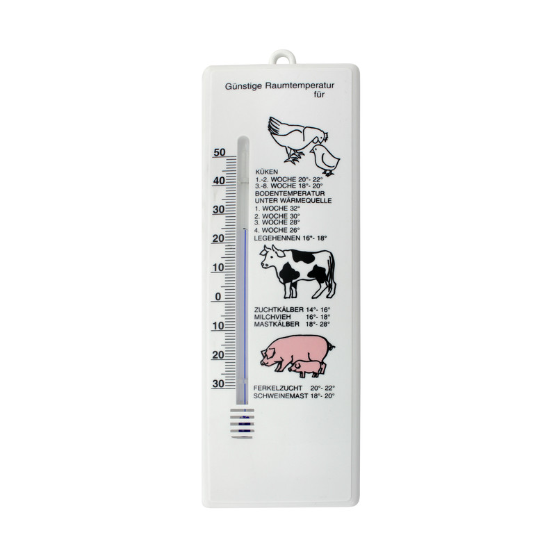 Das quecksilberfreie Stallthermometer aus Kunststoff zeigt zuverlässig die Raumtemperatur von -30 °C bis 50 °C an. Auf das Thermometer sind Empfehlungen zur korrekten Raumtemperatur entsprechend der Tierart aufgedruckt. Dank einer Öse kann das Thermometer einfach aufgehängt werden.
