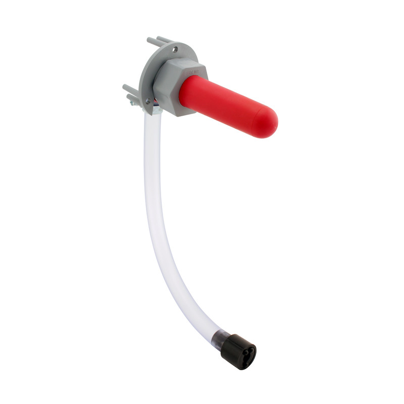 Dieses Steigrohr-System kommt zum Einsatz, wenn eine einfache Montage und Demontage des Systems erwünscht ist. Die hufeisenförmige Wandhalterung wird mit Hilfe von drei Schrauben sicher an der Wand fixiert (die Stifte dienen als Abstandshalter). In die fixierte Wandaufnahme kann das Saugerventil leicht eingesteckt oder entfernt werden. Wird nun der Schlauch auf das Saugerventil gesteckt, kann Milch aus einer Kalttränke befördert werden. Das Rückschlagventil verhindert ein Zurückfließen der Milch.