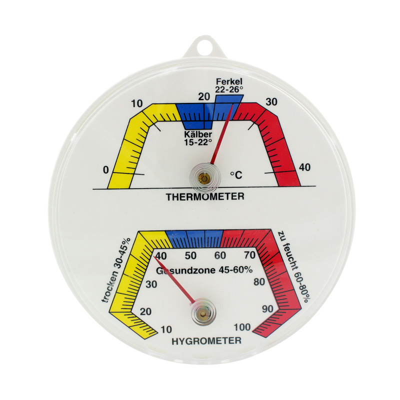 Das Thermo-Hygrometer zeigt zuverlässig die Temperatur und Luftfeuchtigkeit in Räumen an. Die Kontrolle des Raumklimas durch gezieltes Heizen und Lüften schafft ein behagliches und gesundes Tierhaltungsklima. Die optimalen Klimawerte sind auf dem Thermo-Hygrometer aufgedruckt. Die Temperatur wird von 0 °C bis 40 °C und die Luftfeuchtigkeit von 10 bis 100 % angezeigt.